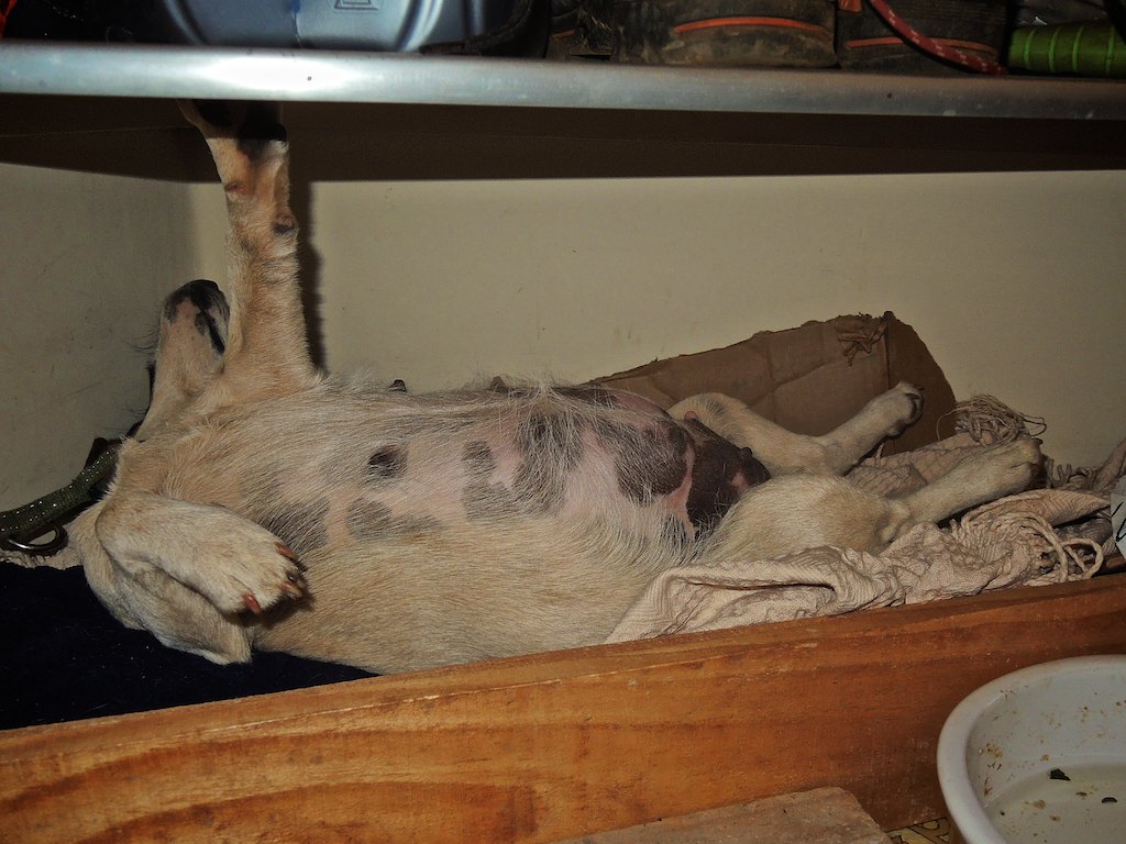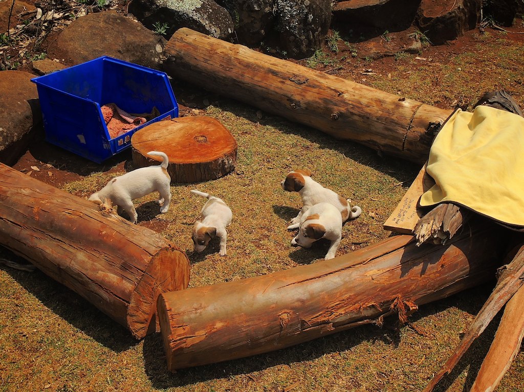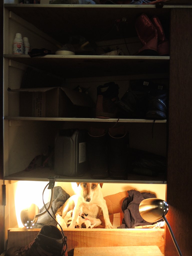 Back in August Petra gave birth to seven small Jack Russell puppies in the high-tech Hornbydale birthing suite.  Yours truly was midwife for the day – though in the end Petra was an excellent mother and knew exactly what to do. Extra heat lamps provided as it was still winter here in Zim. In the end five pups have survived and are doing well. More ‘cute’ pictures and their names to follow (after much lively discussion,  a high level board meeting and a shareholder vote).