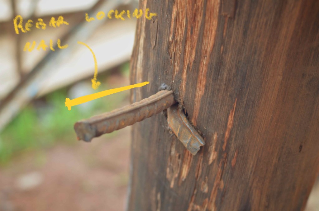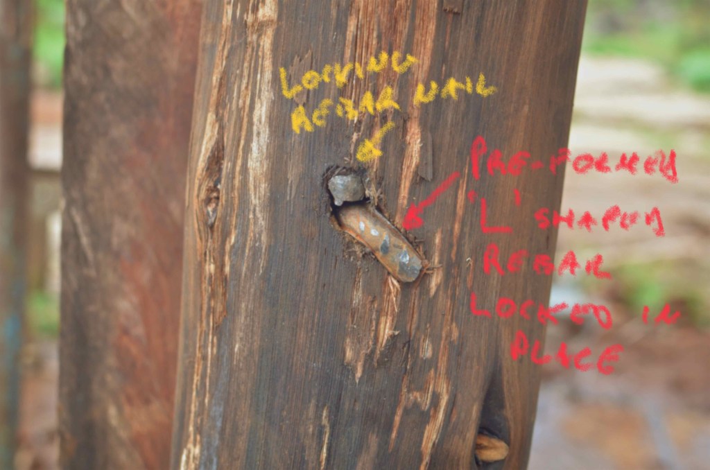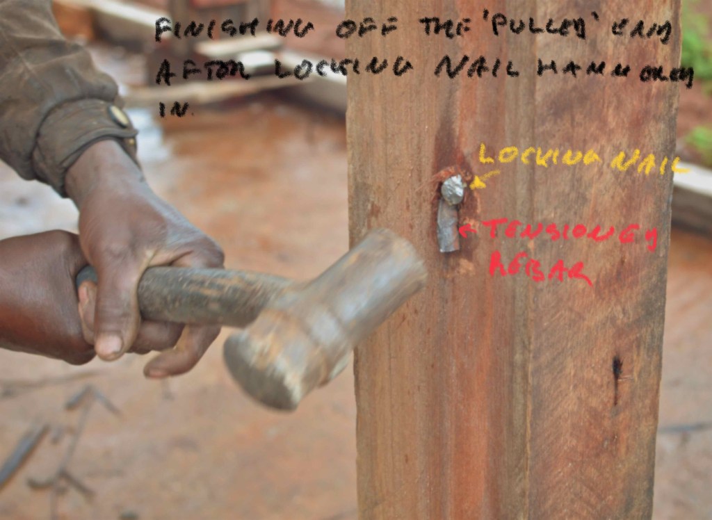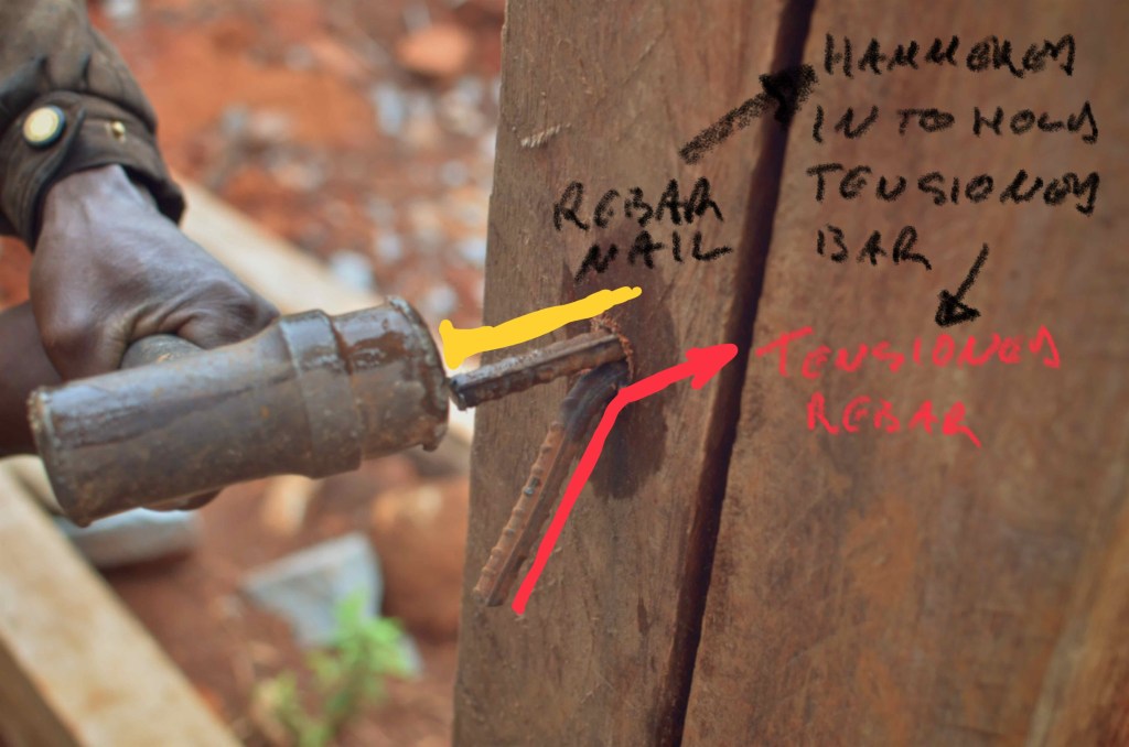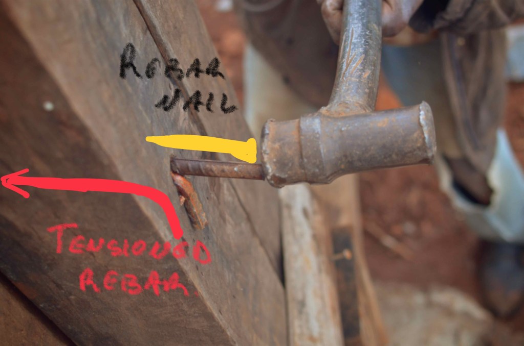 Now another locking rebar nail is hammered into the end we just tensioned and bent to lock it in place