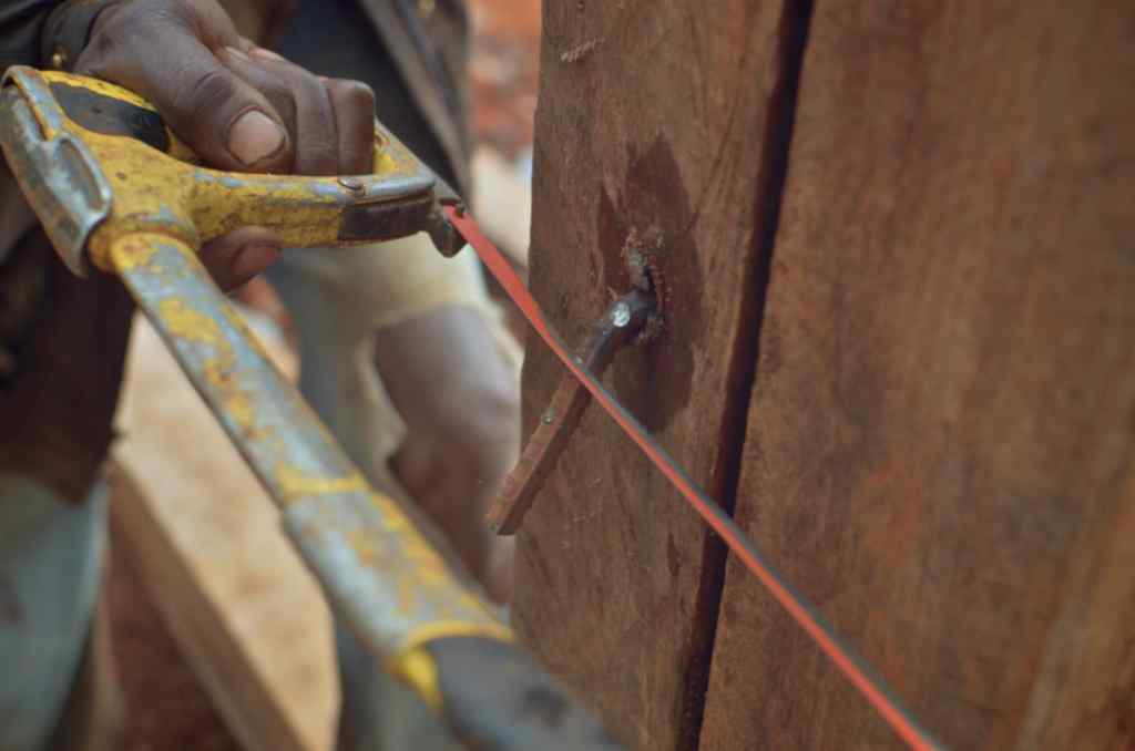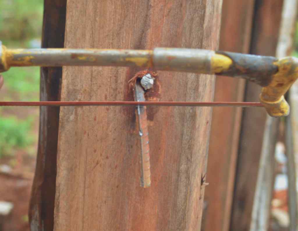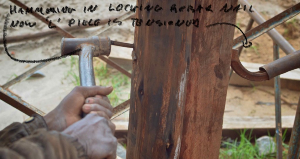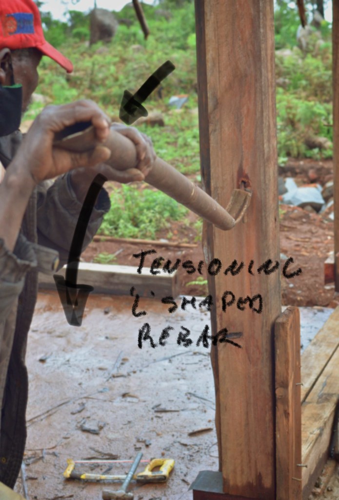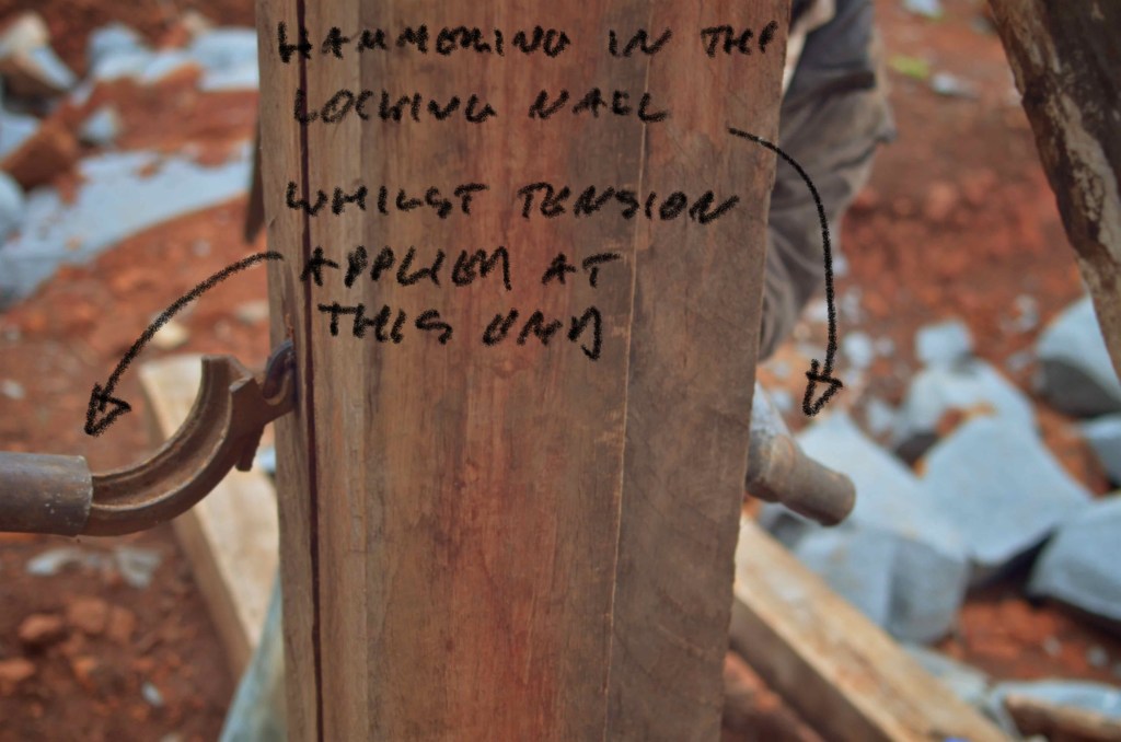 Now another locking rebar nail is hammered into the end we just tensioned and bent to lock it in place