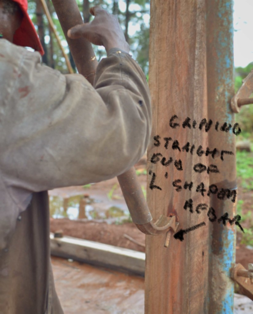 To start with an ‘L’ shape was made out of rebar and inserted through hole previously drilled (with a long rebar drill bit) through two or three in the set of uprights. Each rectangular upright is 114 x 152 mm (approx) eucalyptus.