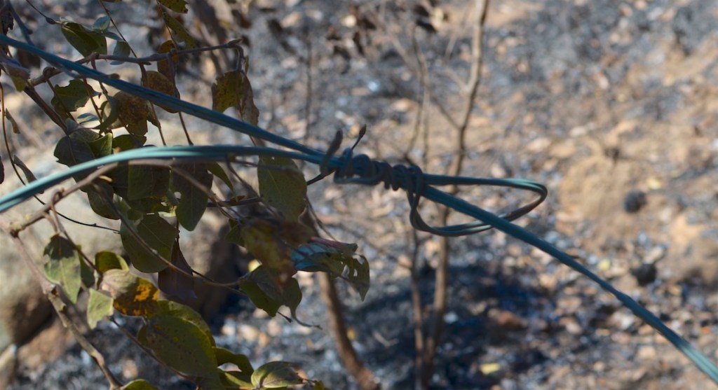 An alarming find – a large (animal) snare blocking my path! Made from incredibility strong wire. Does not look so expertly positioned now – perhaps because of the recent fire, and / or me touching it.