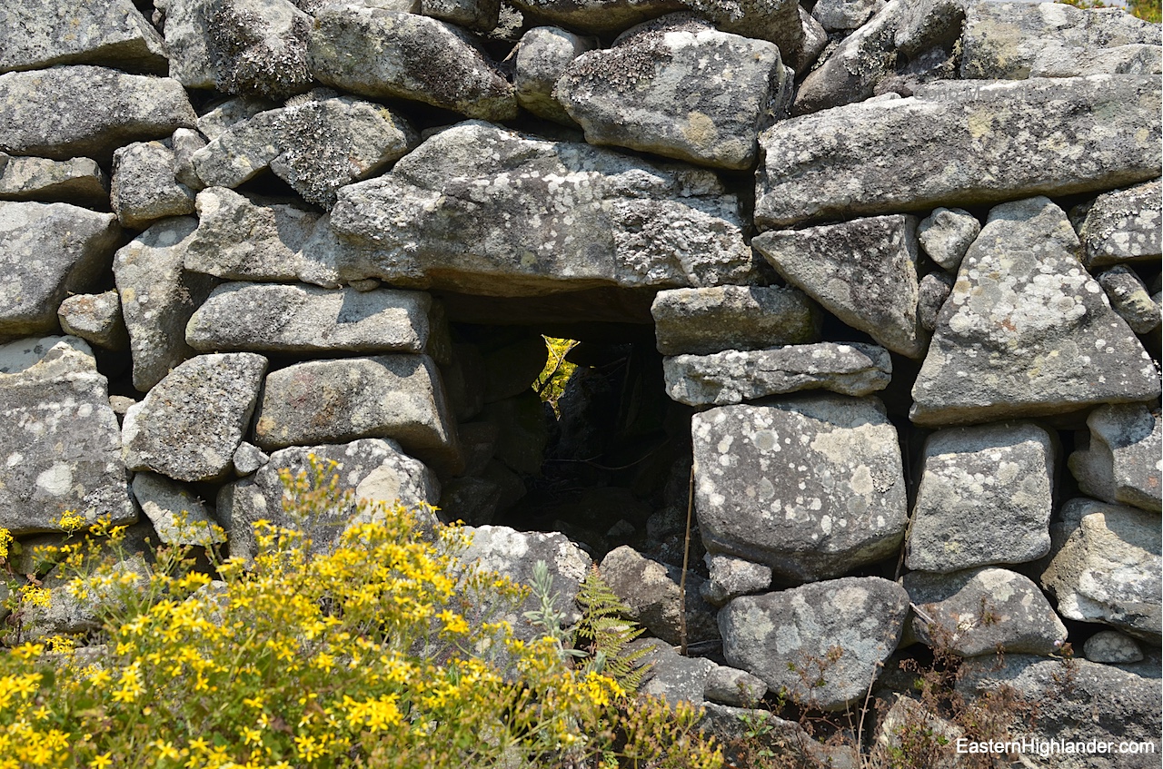 Recently trodden down human ‘pathways’ were the only clue to a tough-going, bumpy, wide circumnavigation of the obvious walls starting at the west side. Some loop holes remaining, with flat lintels above – see pics. Looked like additional walls or terraces submerged by vegetation or earth on this western side. Some exotic plants including an unavoidable manic succulent type thing underfoot and these yellow flowers everywhere.