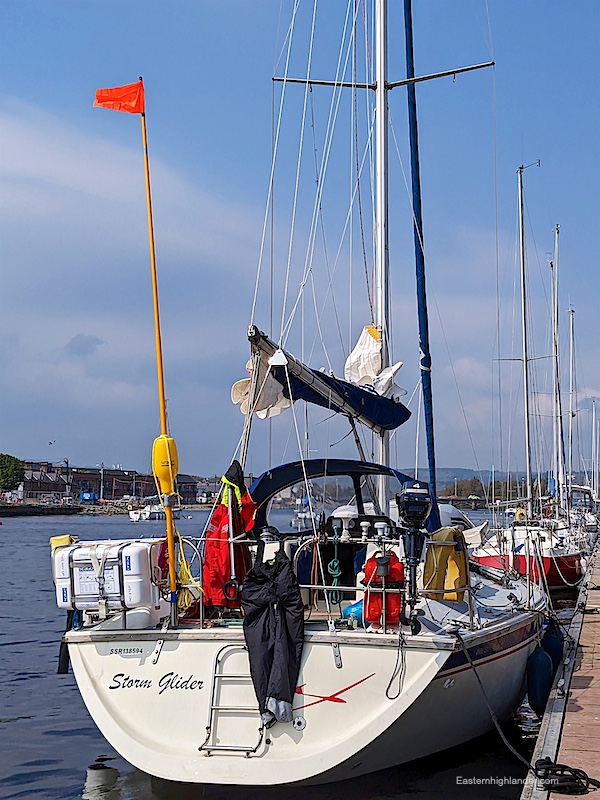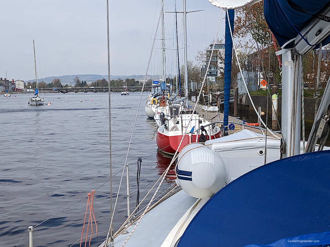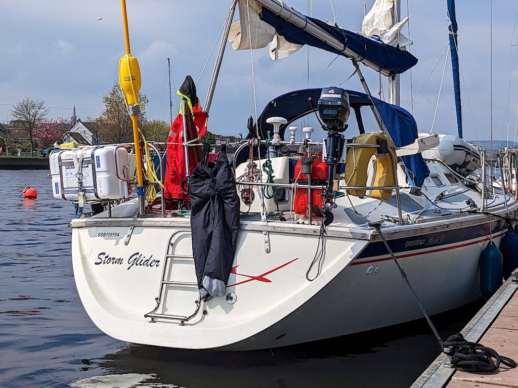 Welcome to Arklow. Nice marina showers!!! (best not to count the days) And the kind manager gave us lift to the petrol station for more diesel (something you should know about relocating a sailing yacht over Easter). Here we are alongside the easy-to-access river pontoons – looked a bit tight in the marina basin. Large shopping centre close by on this side of the river. Town centre and harbour access via the road bridge.