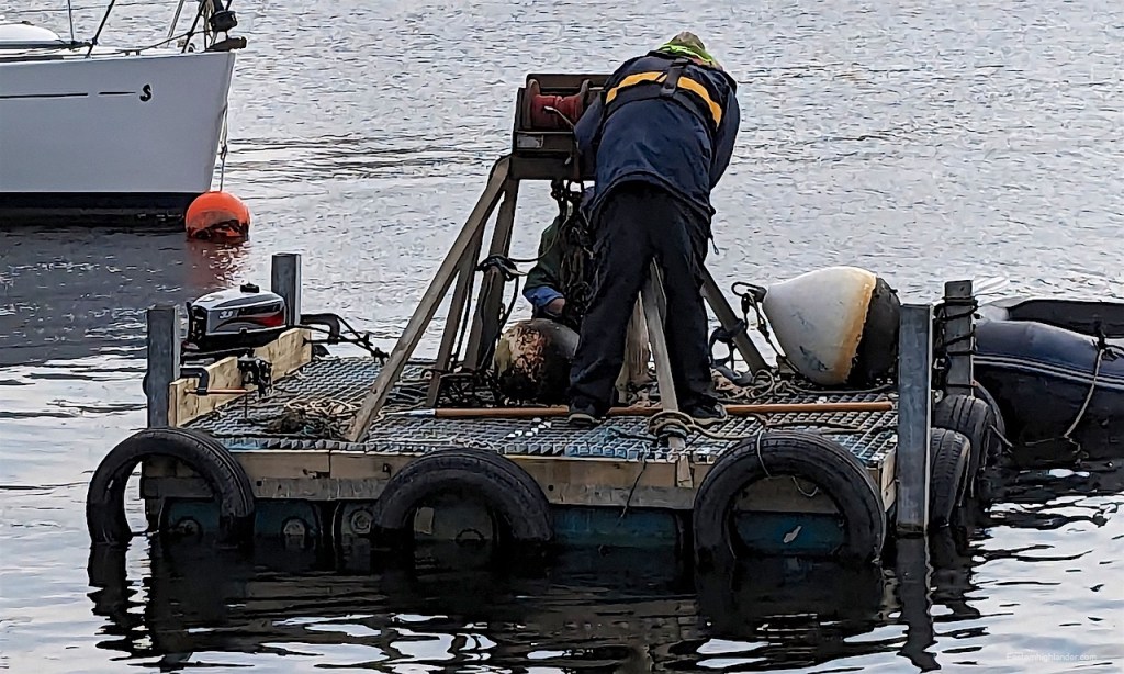 It is a rather ingenious contraption, or raft, built like a square doughnut with an outboard for manoeuvring and with a central hoist for lifting moorings. This was not an easy process yet a fine way to use up most of a day.
