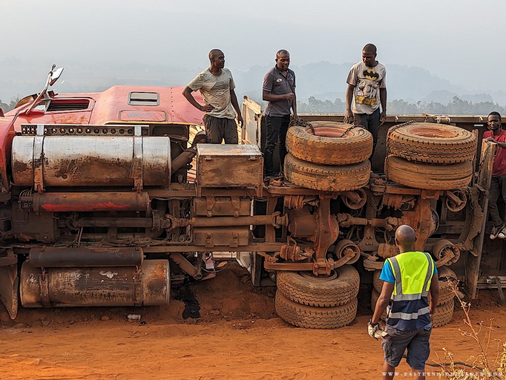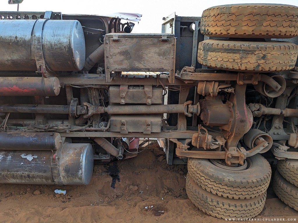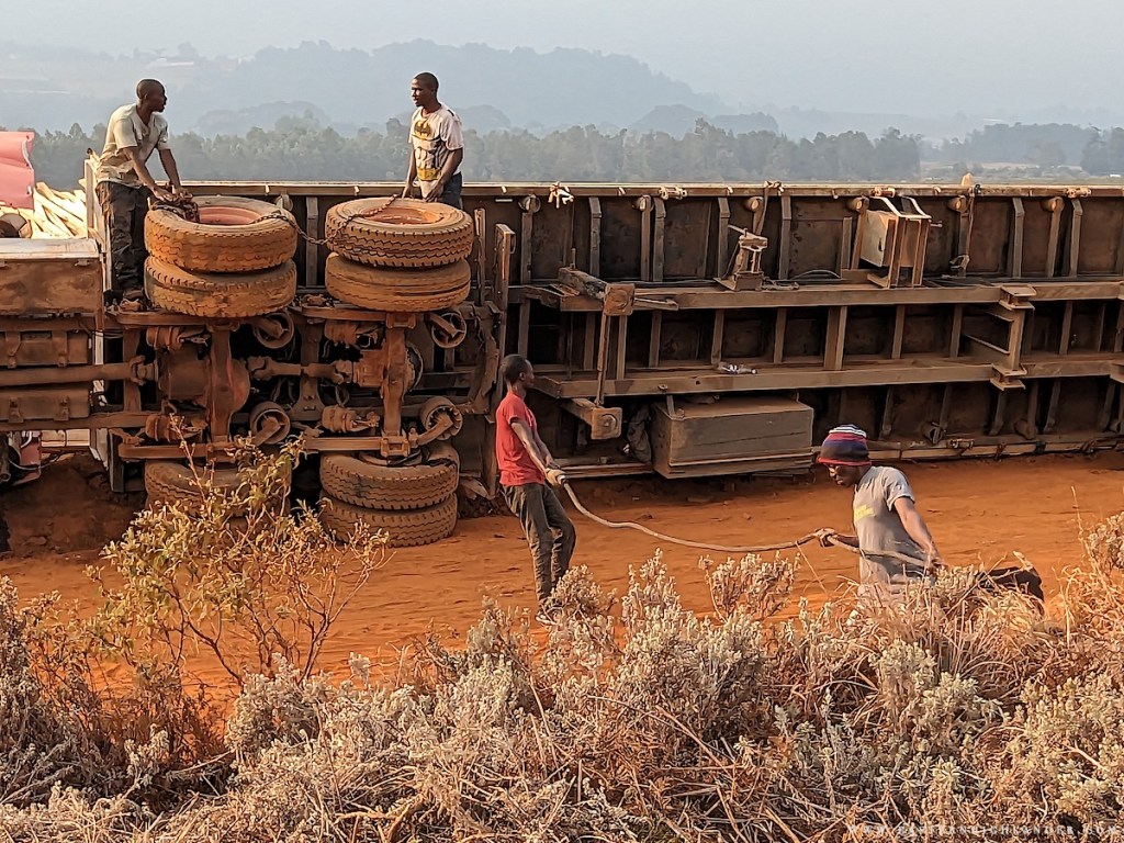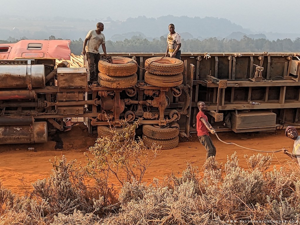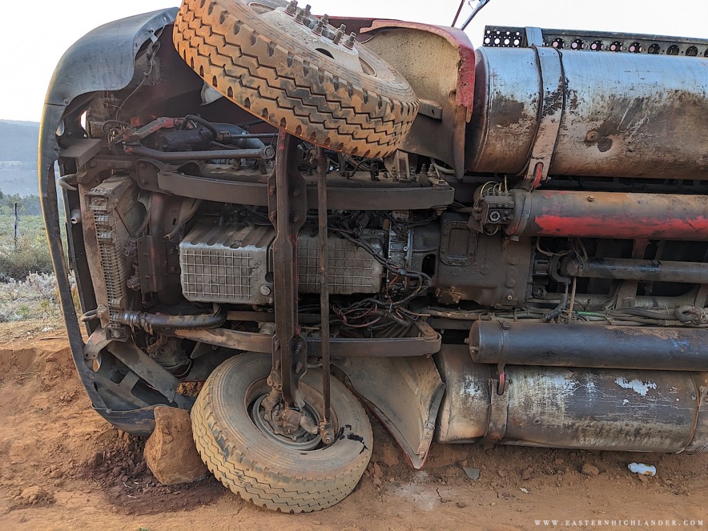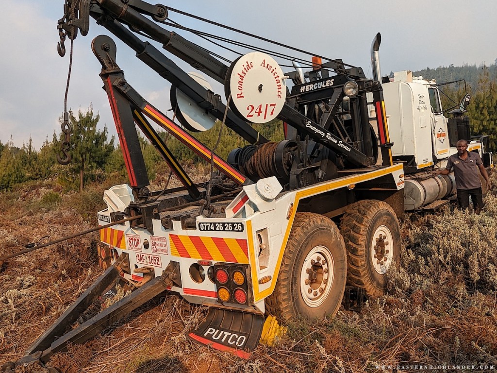 Came across this when out for a walk and went back the next day to see what was going to happen. The owner had driven out from Harare and ordered the massive breakdown truck which simply and easily pulled it back over in a oner – the video is on Facebook! The person who had leased it was also there, as was the driver who had accepted the load! After some checking it started first go.