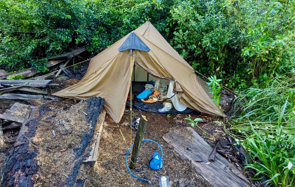 At the four corners of the flysheet the loop hole of the tensioner strapping (webbing) is very small and so, after my recent camp on the sawdust mound below, I added larger safety loops to the bottom corners of the fly so that I could hammer through a medium size stick to hold it if necessary. Without this firm hold on the flysheet you suddenly understand that the tent is not going to stand up properly when tensioned – hence these loops provide me with some insurance!
