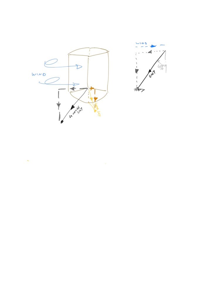 (If the 4 metre guy was pegged out at 45 degrees then half of the tension in this line would be acting against wind coming from the same side. And, if its angle was shallower, a smaller proportion of the yellow, door-guy tension would resist wind coming from the other side. Now the tent is not relying solely on the four corner pegs to resist side winds so we have a stronger set up. See sketch at the very bottom.)