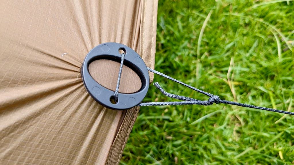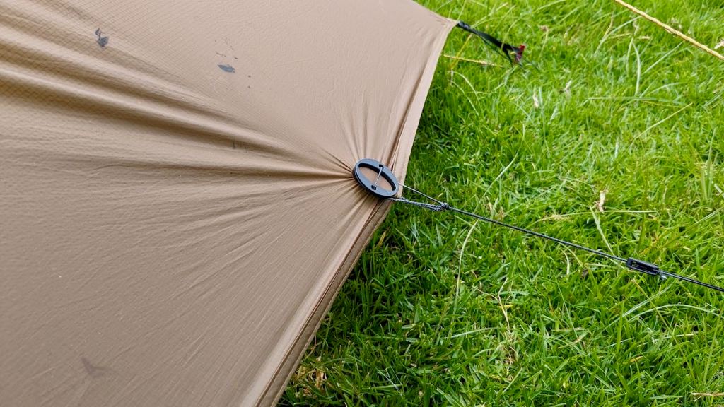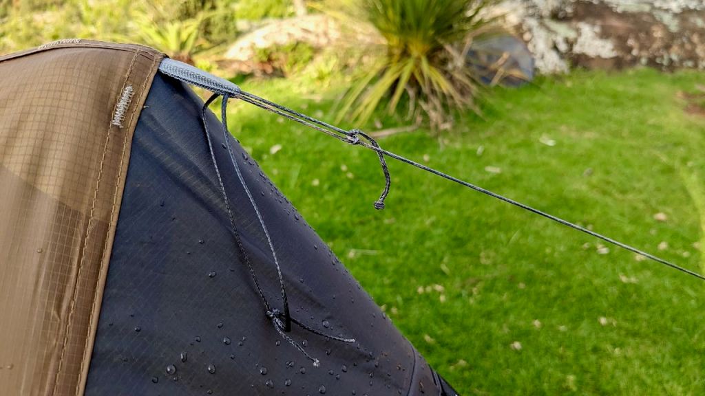 Second, a greater ability to find good ground for the extra tent peg required – or an alternate hold on something with in range. You can easily rack it in to a shorter length with the Line-Lok when in a tight spot. Add the tensioning Line-Lok loop at the bottom of the guy so you can loop it round a rock or what-have-you then tighten. I got this the wrong way round to start with.