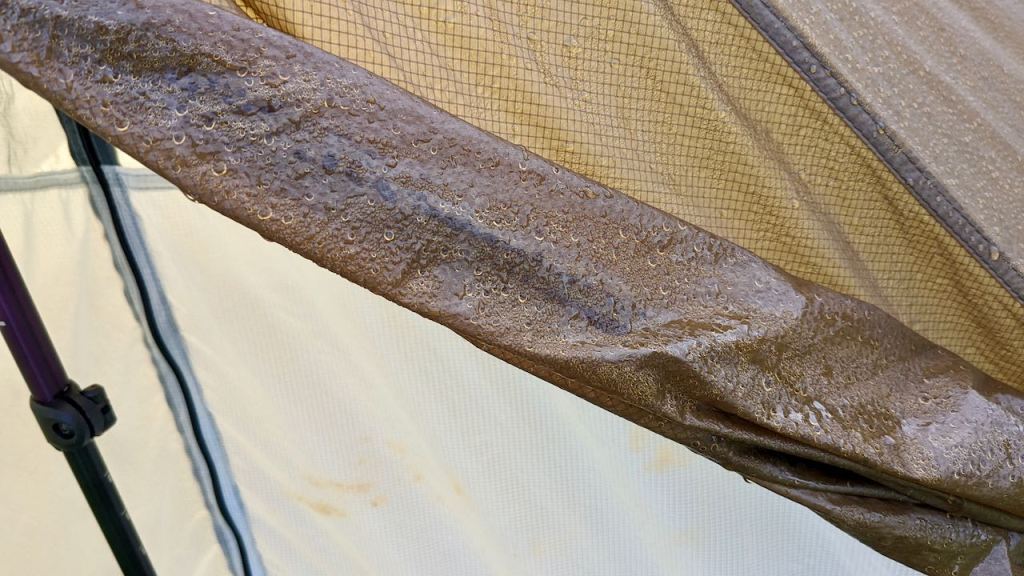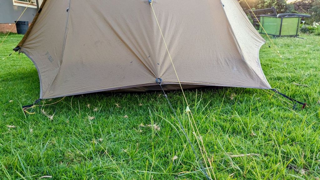 There is no getting round it, when wet, from rain, or from my heavy-dew-condensation combo (i.e. every morning for me at the moment, with +50% humidity in the day-time and higher overnight – I left the tent up overnight at the house to test the inner condensation inside the fly), this whole thing is going to droop and wilt dramatically! And, possibly, lead to unwanted touching, of the inner and fly, and then, possibly, leakage – meaning some water in the tent. I understand it comes with the territory using this lightweight material and for £150 I’m not complaining too much!