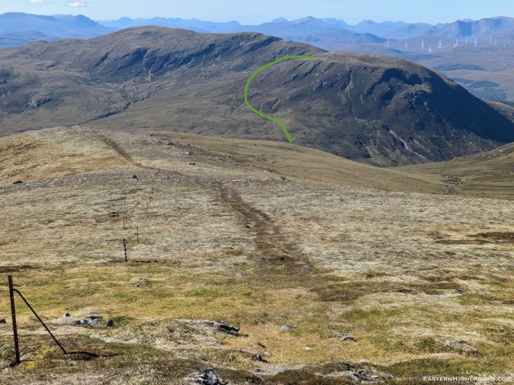 After the photoshoot have a luxurious rest in a heather-moss cushion contemplating the day ahead – wondering if you should even bother with The Ben after the views you’ve already seen. Put those thoughts away and swing round on the path to Tom na Caillich and continue west-ish down off the hill. Having spied the distant Argocat tracks up the 817m spur of The Ben you will know where you want to end up crossing the burn. There was no path down this side of Tom na Caillich and I imagine it could be very boggy after rain(s). Totally on your own in the heather and bogs with no useful paths or tracks. Cross the small stream, re-fill, find the track and start slogging up! Not that pleasant after a tiring few hours in the heather. There is enough of a way up to 817m with multiple Argocat tracks to follow. More sightseeing once you gain the ridge. And yes, another slog up to Glas Leathad Mor. You have probably been on your own now for hours, but that is not to last 😉