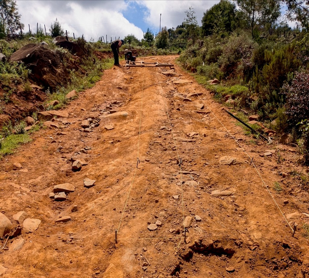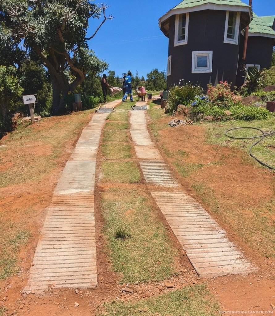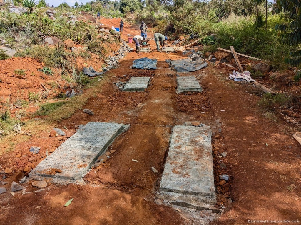 Each segment is 1.5 m long and we make two parallel segments at a time using one of our wooden ‘forms’. Then we jump 1.5 m, leaving a gap, and put another form down and make the next pair of 1.5 m segments.