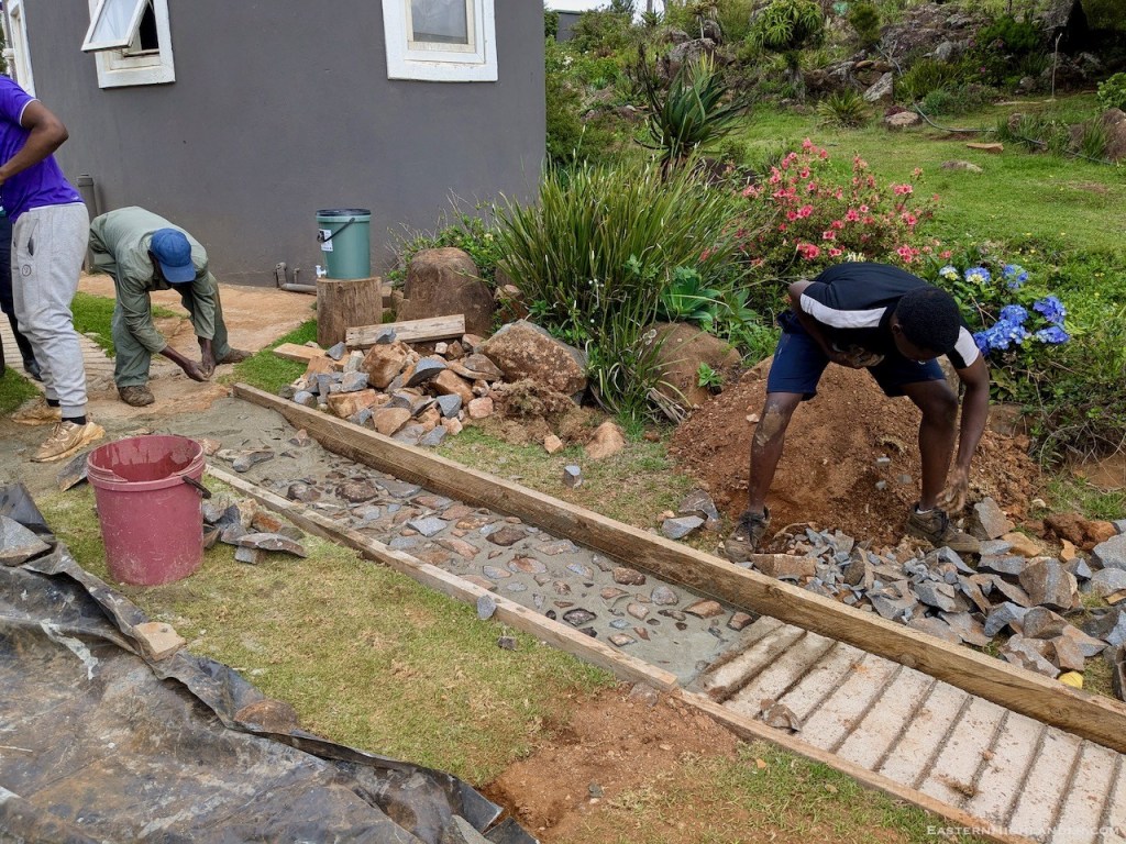 Overfilling one of the segments: because we use a wooden ‘form’ there is a huge, undeniable, magnetic force on who ever is filling the concrete and stones to fill in the form to the top of the parallel planks, whereas the string/line (that should be in place) going from existing form to existing form says otherwise. I.e. the level of the concrete may need to be lower than the side planks of the form.