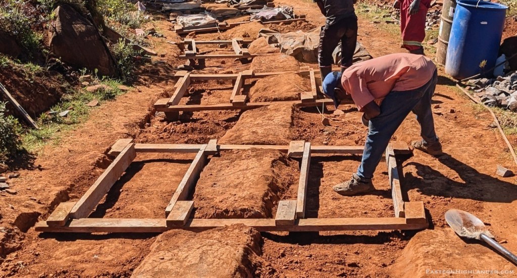 The starting point is the wooden ‘form’ (‘foroma’ locally). Easier to show than explain: Mr Tongai has his foot in one segment of one form, below