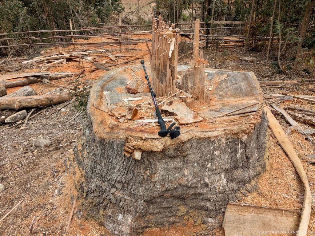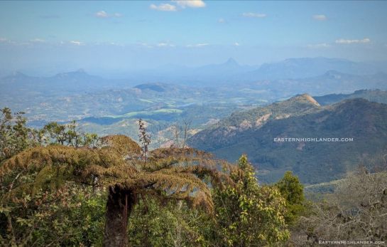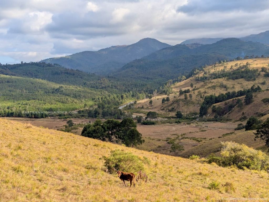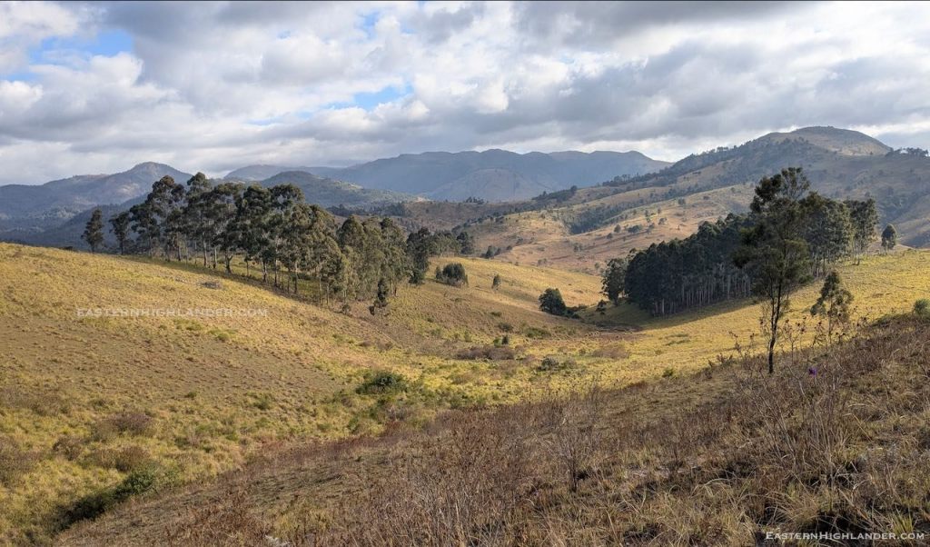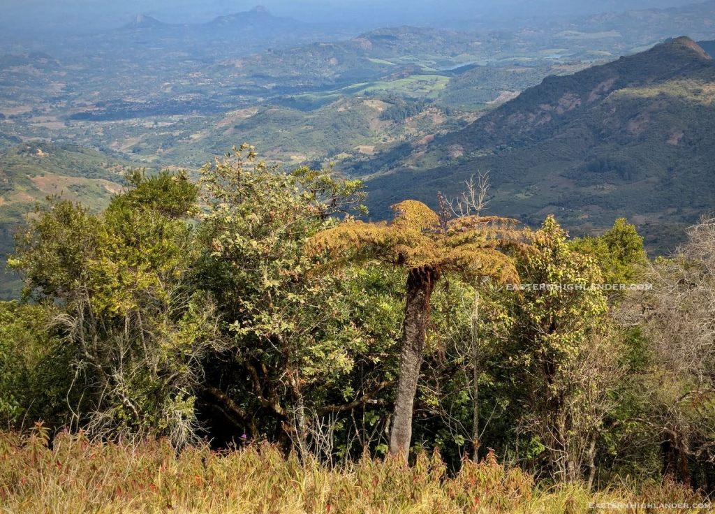 Down in the general direction I thought I needed to be going. I tried a spur as an interesting shortcut but that ended steeply and I retraced before dropping further, going through a couple of small farms. Tramped on and almost double backed south to get to a low river crossing with log bridge and a food stop to dry the tent. Thereafter all uphill to get onto the ‘ridge’ peeling off from the more direct path down to Sagambe and Aberfoyle. Tough going after the 20km yesterday but the views were going to make it worthwhile I was sure. Gum to start with then Msasa. The way cleared on top to long grass to the north with rolling hills and the Afromontane type forest dropping very steeply to the south – see pics with tree fern.