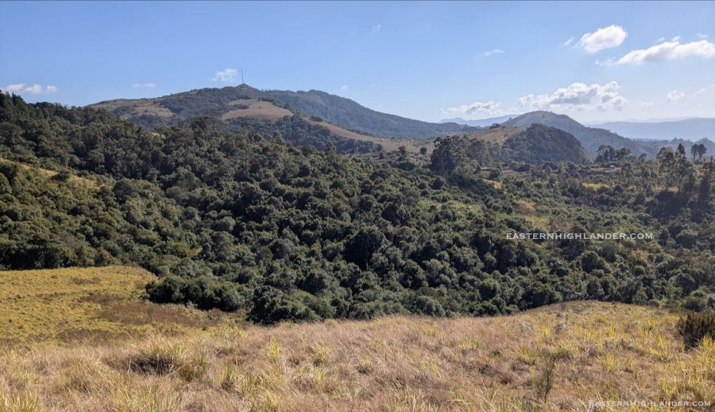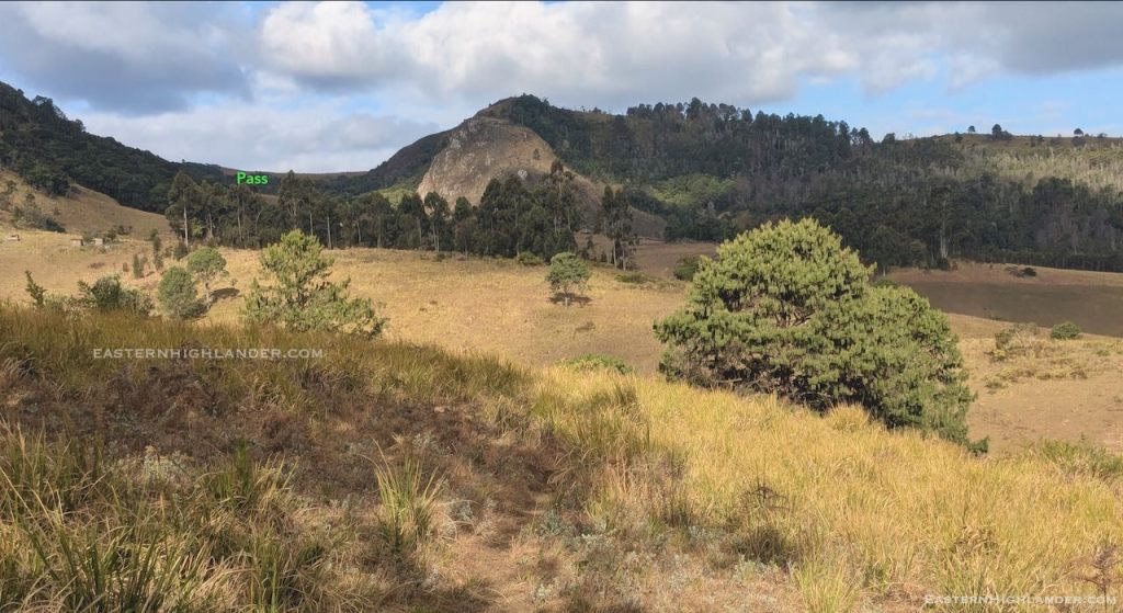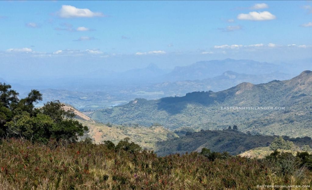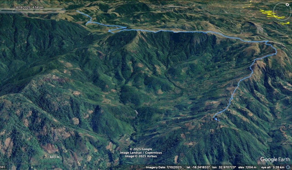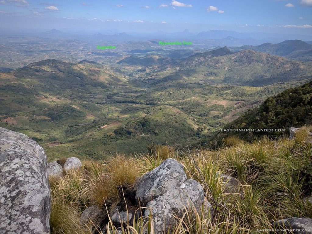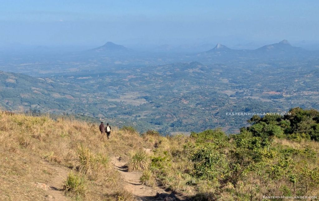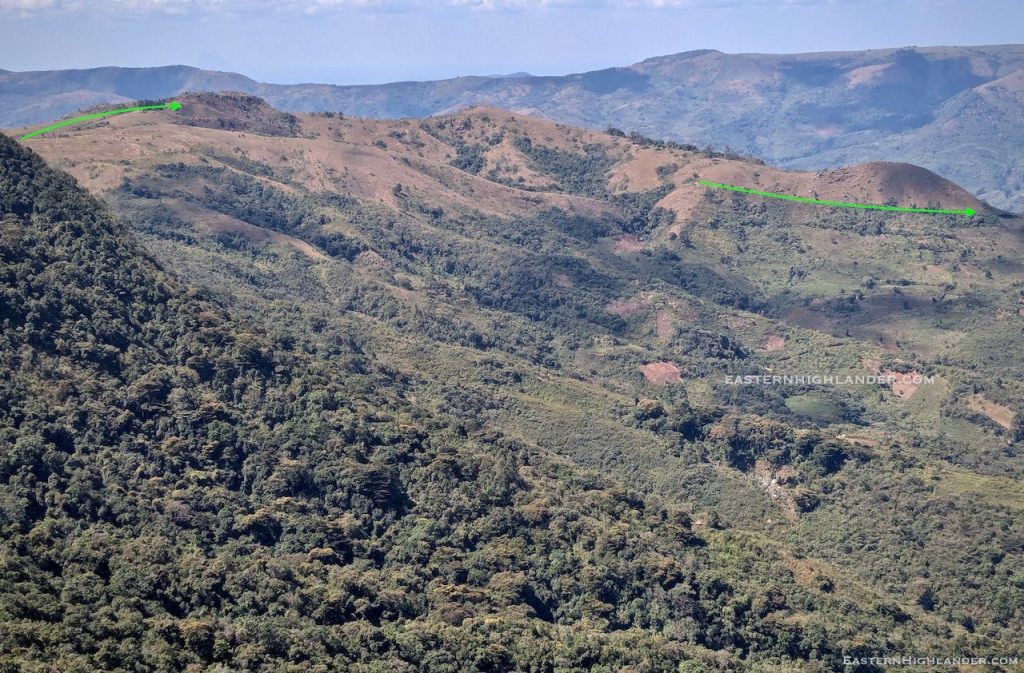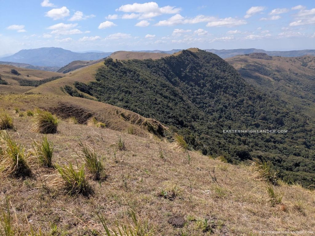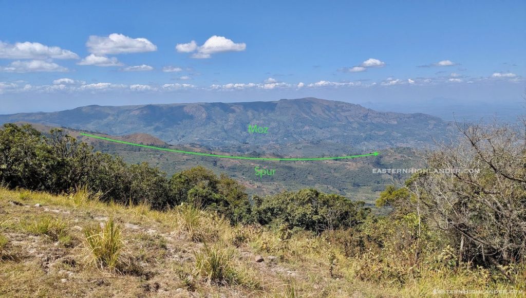 Reasonable path on the ridge though it circumvents most tops and you have to make a special effort to go up them for the views south into Honde. The last top is rocky and has the best views of the onward journey on the downward spur and across to Mozambique. Later, looking back this top appears to have a vertical face on the south side.