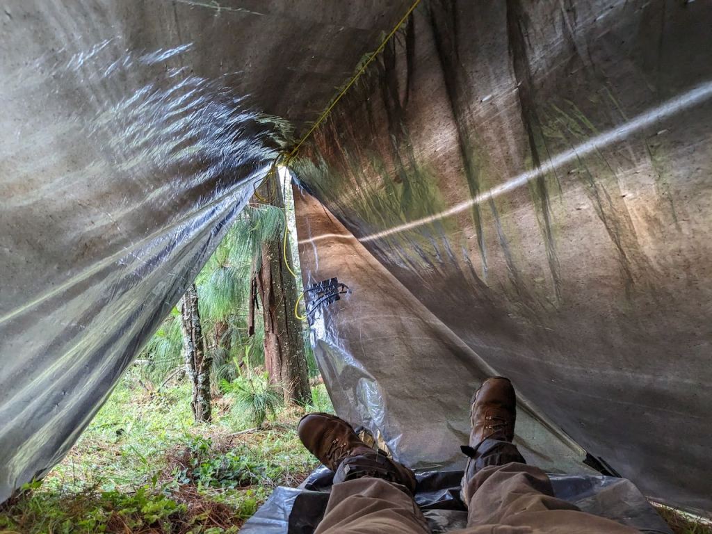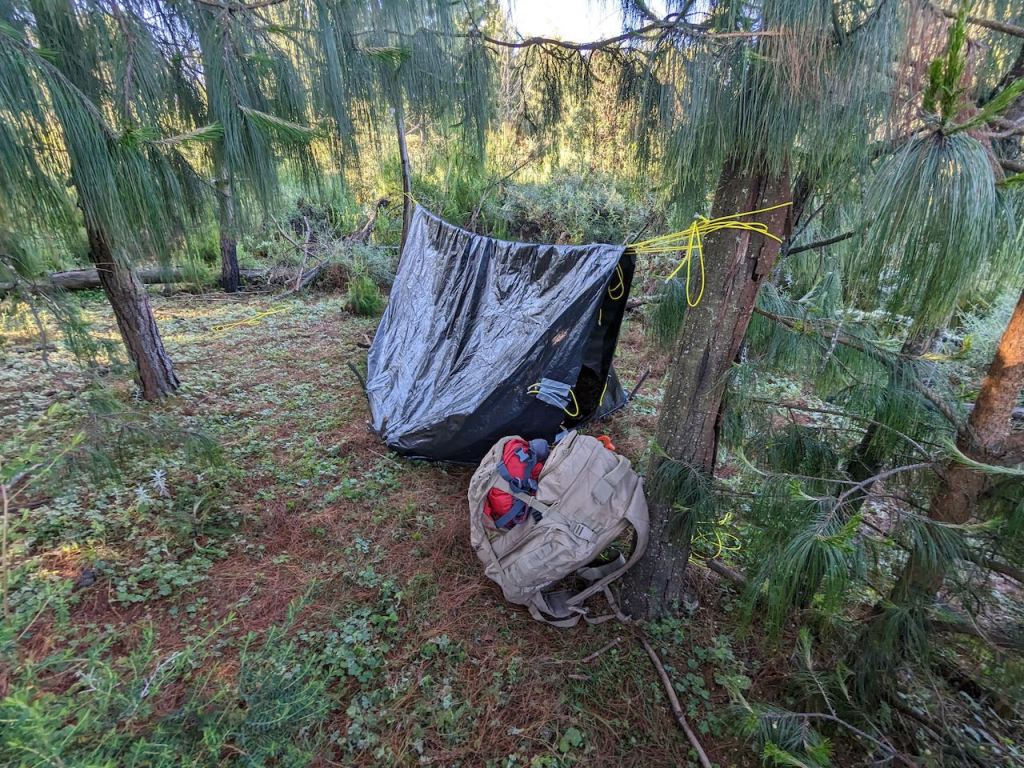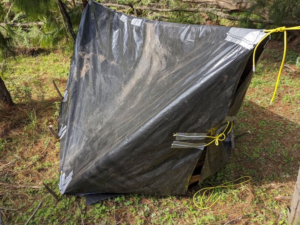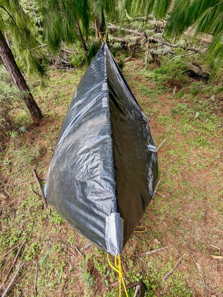 Then the tarp was pitched down to the ground and folded at the ends to form ‘doors’. This though compromised space as the ends had to folded in and under the ridge if they were to be tied together.