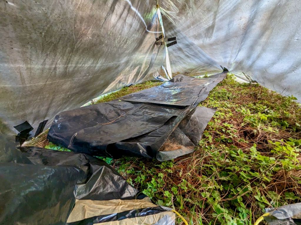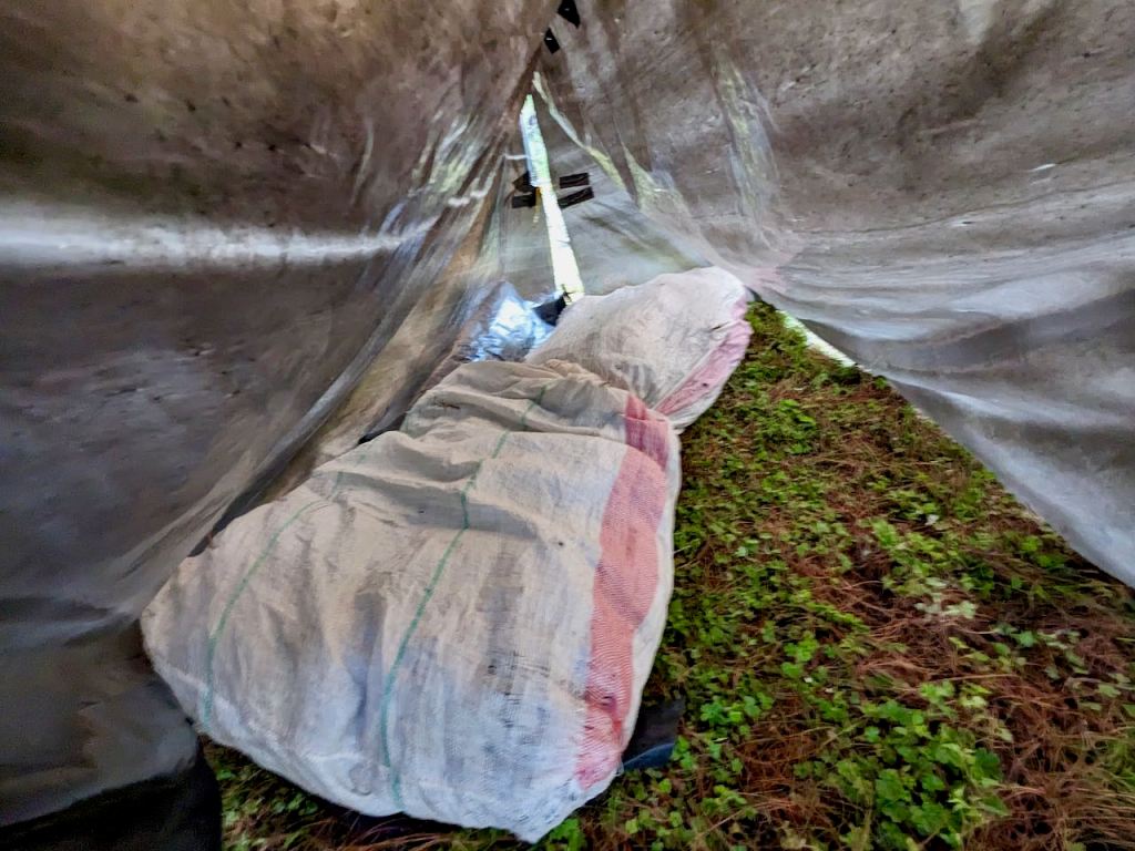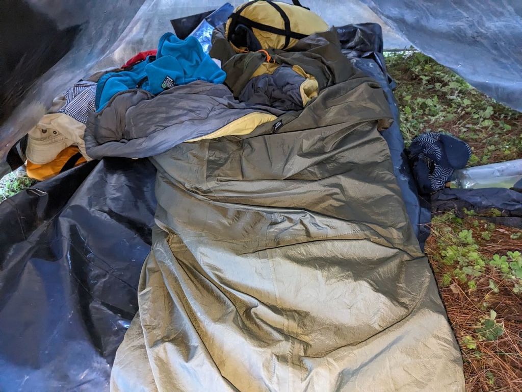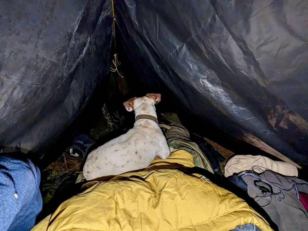Then the tarp was pitched down to the ground and folded at the ends to form ‘doors’. This though compromised space as the ends had to folded in and under the ridge if they were to be tied together.
