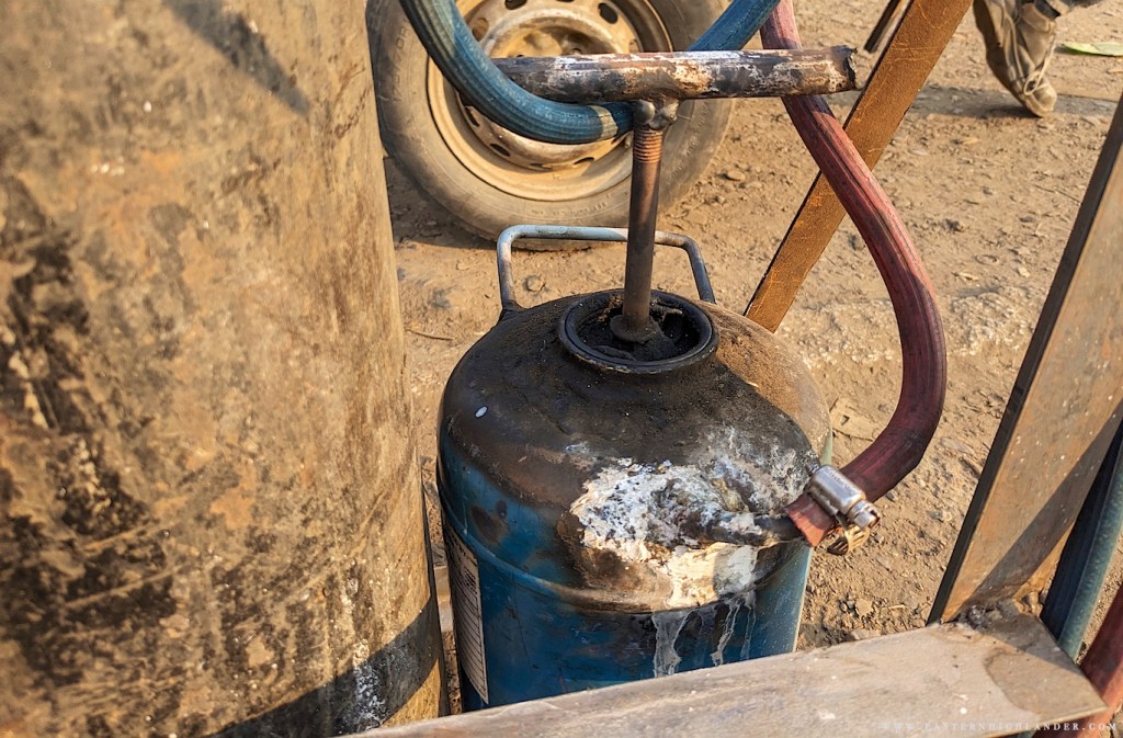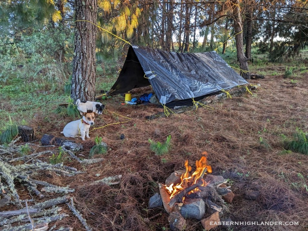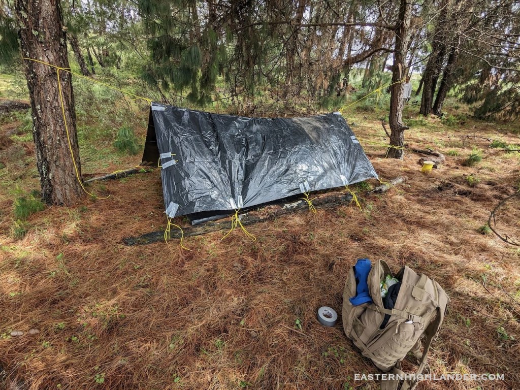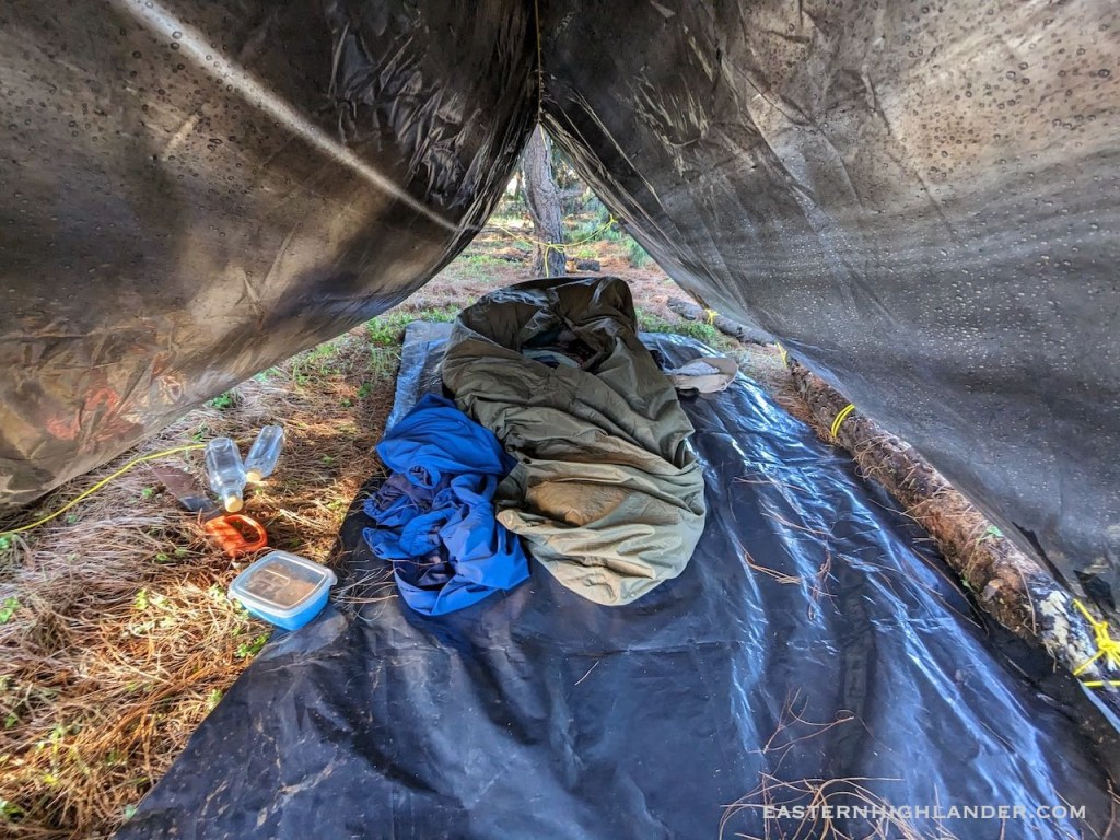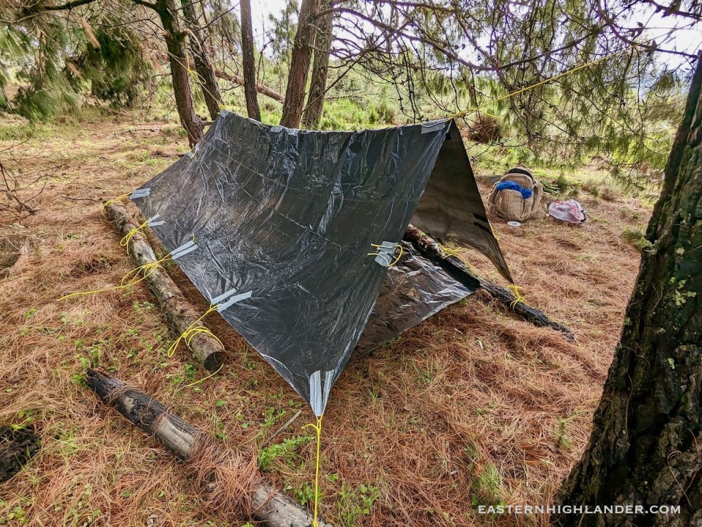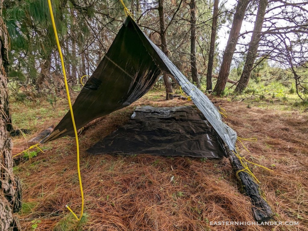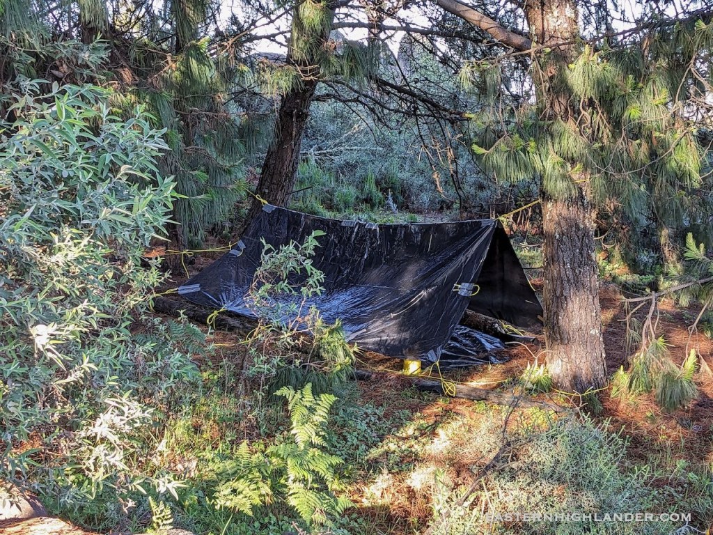 In November the old Vaude tent from the 90s was lost or misplaced so there was no option but improvise with the only thing available – some black plastic sheeting, duct tape and paracord.