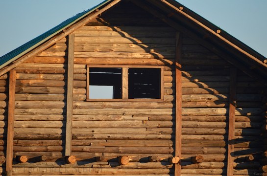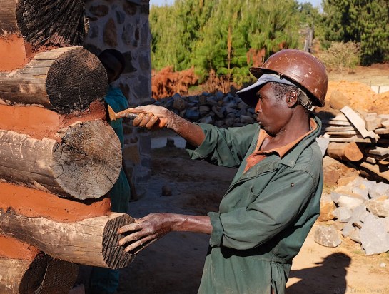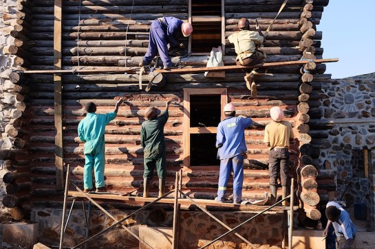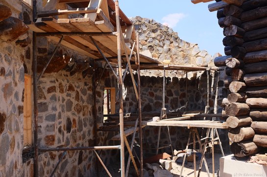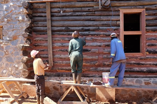Now this is good – we brew our own chinking, or caulk, and get to work on those horizontal gaps between the logs: