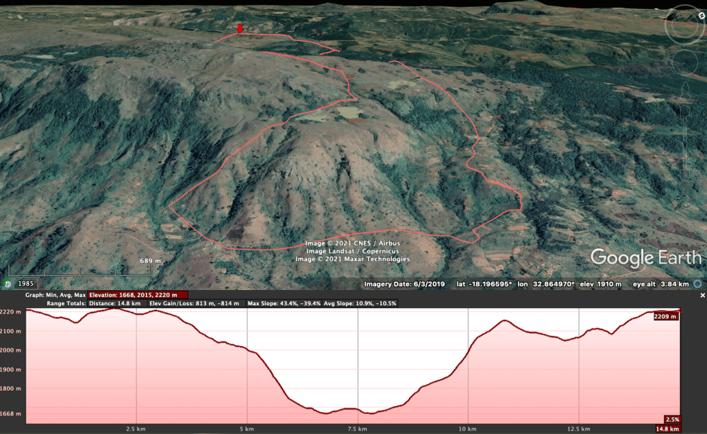 Reach the level area at 2220 m, and sometime potato fields, start to walk through the messy, fire and logger decimated ex-woodland. Now a bare patchwork of blackened stumps, off-cuts, mounds of sawdust and fallen trees too narrow for the mill. Rising way over the height of the trees the forest fire in November 2019 was so hot and fierce no undergrowth has really come back at all.