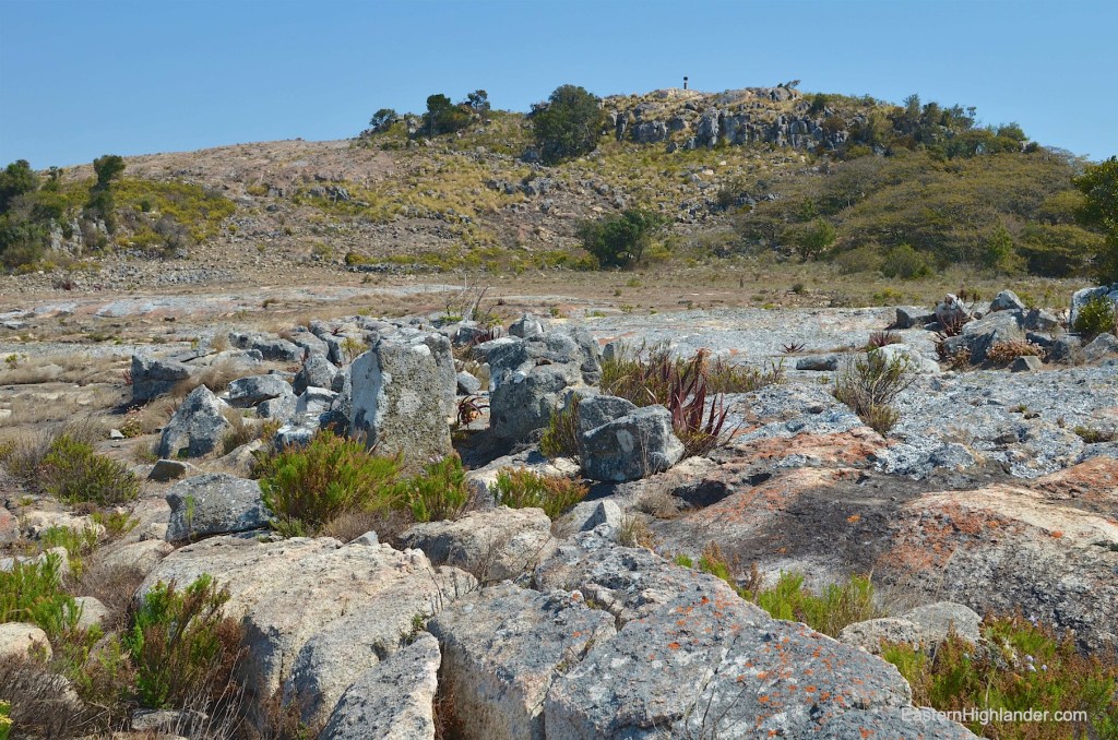 My efforts to find a path up did not go quite as planned and I was forced to scramble between the sparse low Msasa-type trees in-order to gain the ridge ahead and to the south. This became slightly easier and I found two Shona dry-stone circles nestled in a hidden spot. Soon I came across a bizarre but welcome way up consisting of a ‘path’ of cleared rounded stones. Tough to walk over but easier and clearer than any alternative.