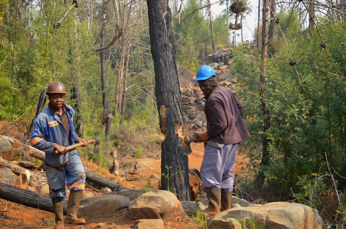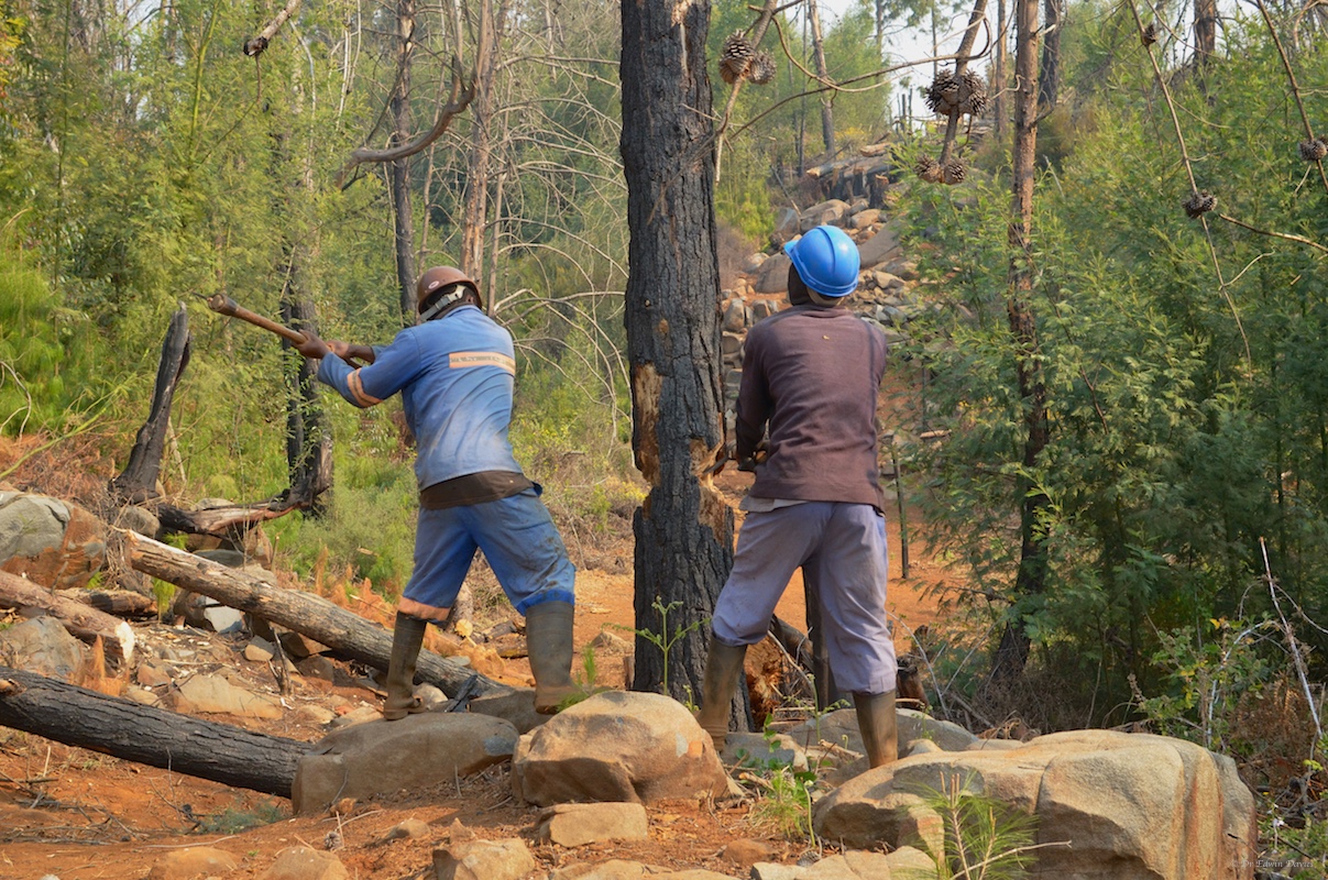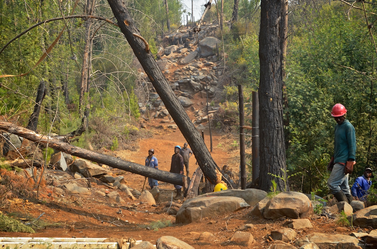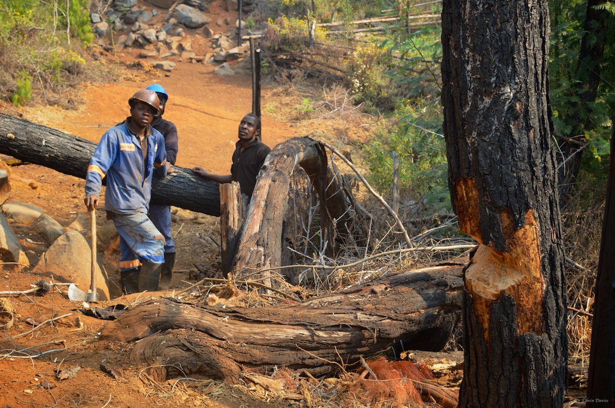 First: the electricity line up from Troutbeck enters Hornbydale running through the bottom of a small valley. Along the valley sides pine, wattle and gum trees have grown over the last 20 – 30 years. Now they tower over the electricity (ZESA) lines and we are carefully removing them on both sides. The direction of the prevailing wind is of course just right to blow weaker trees onto the line.