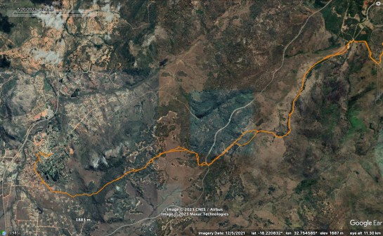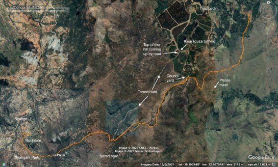 Finally, this section ends with a very steep descent under the two ZESA lines down to the tarred road. Some holding-on on the way down; it’s easier on the way up! Kind of is and isn’t a path all at the same time; I’m guessing ZESA walk it infrequently – there is the odd new pole.
