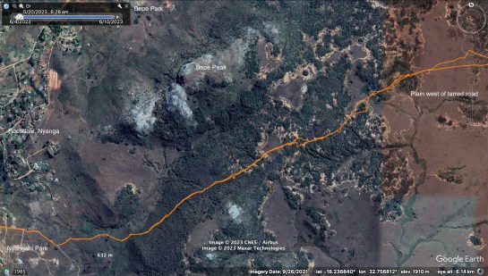 Eventually hook-up with the line of a mainly buried black and blue water pipe and basically follow this all the way (there is a gully on the way which is a cooler place to take a break if it is a hot day) to behind the Bepe hills from where you will find the path down the southern side of the valley and into Nyangani Park.